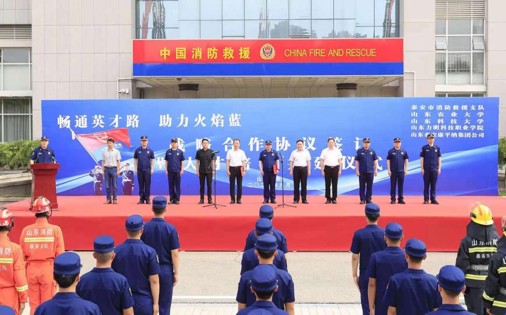 签约仪式上,王靖磊代表驻泰高校表态讲话。他说,泰安市消防救援支队和康平纳集团立足单位未来发展战略,为提升单位人员的业务水平及专业技能,充分借助驻泰高校的人才和专业优势,实现高等院校与用人单位之间的资源整合,开启了泰安市消防救援支队、康平纳集团和高校合作的崭新篇章。高校将充分发挥人才优势、学科优势和科研优势,竭诚为泰安消防救援支队、康平纳集团的可持续高质量发展提供智力支持,泰安消防救援支队、康平纳集团也必将为高校人才培养和成果转化提供平台。希望通过各方共同努力,真正将消防救援人才培养工作做实、做优,为打造泰安消防教育品牌、培养消防专业人才、推动全市消防救援队伍全面转型升级,提供坚实的基础和保障;真正契合高科技企业人才需求,推动科技成果产业转化与推广,在推动节能减排转型升级、实现新旧动能转换方面发挥高校的服务经济社会发展能力。